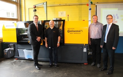 Anlässlich des Festaktes zum 125-jährigen Jubiläum brachte die Firma Continental ein großes Geschenk mit: eine generalüberholte Spritzgießmaschine. Diese wurde nun in einer kleinen Feierstunde am 17. Juli in Betrieb genommen. Fachlehrer Peter Knierim hatte die Maschine in enger Zusammenarbeit mit Conti in den letzten Monaten an ihrem neuen Platz in der Metallwerkstatt aufgebaut.