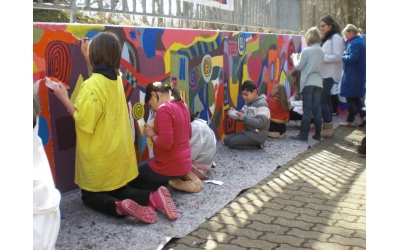Jugendhofleiter Klaus Dieter Raub hatte die Idee, einer tristen Betonmauer ein wenig Farbe zu verpassen. Dabei kam es zu einer gelungenen Kooperation zwischen Schülerinnen und Schülern der Bebraer Grundschule und von Schülerinnen aus der Fachoberschule Gestaltung der Beruflichen Schulen Bebra.