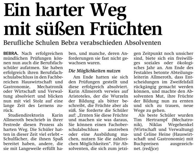 Sie besuchten in der Fachrichtung Wirtschaft die Schwerpunkte Ernährung/Gastronomie/Hauswirtschaft und Wirtschaft und Verwaltung sowie in der Fachrichtung Technik den Schwerpunkt Mechatronik. Abteilungsleiterin Karin Allmeroth nahm zusammen mit den Klassenlehrern die Verabschiedung vor.