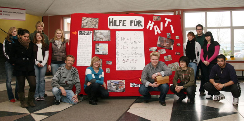 Besonders engagiert hat sich bei der Spendenaktion die Unterstufenklasse der Auszubildenden der kaufmännischen Berufe (10 K1). Sabrina Dürr stellte den Kontakt zur Schülervertretung her. Die Klasse gestaltete eine große Plakatwand, mit dem in der Eingangshalle der Beruflichen Schulen Bebra auf die Situation der Kinder in Haiti hingewiesen und auf die Spendenaktion aufmerksam gemacht wurde.