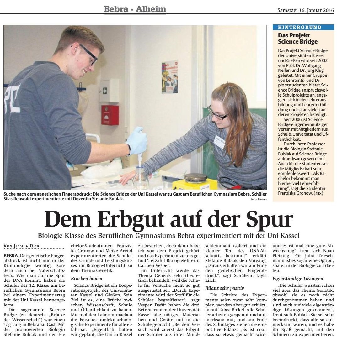 Die HNA berichtete in der Ausgabe Bebra-Rotenburg vom 16. Januar 2016 über das Vorhaben im Biologieunterricht des BG wie folgt...