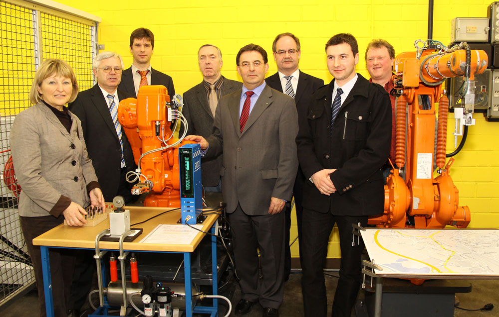 Was das Lernen angeht, ist es in diesem Fall ein Geben und Nehmen. Während die Schüler und Studierenden den Umgang mit den Robotern lernen, lernen die Roboter von ihren Bedienern, was sie zu tun und zu lassen haben: ob sie ihren Greifer öffnen oder schließen, sich drehen, heben oder senken sollen. In insgesamt sechs Achsen können die Roboter verfahren werden. Um zu lernen, wie sie sich später im Automatikmodus bewegen sollen, werden sie zunächst vom Bediener angelernt, indem mit Hilfe eines Joysticks die entsprechenden Wege abgefahren werden.Dass die teuren Maschinen für den Schulträger nahezu kostenneutral geblieben sind, liegt im Wesentlichen an dem Durchhaltevermögen von Fachlehrerkoordinator, Gunther Koch, der die treibende Kraft in diesem Projekt darstellt, und seinen Kollegen. Nach über drei Jahren Vorarbeit konnten nun je ein Roboter vom Typ ABB 140 und ein ABB 1400 samt professioneller Roboterzelle im Beisein von Landrat Dr. Karl-Ernst Schmidt und der ersten Kreisbeigeordneten Christa Bittner offiziell in Betrieb genommen.