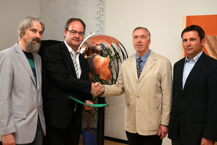 Schulleiter Wolfgang Haas bezeichnete Gunther Koch als einen universell gebildeten Metallfachmann sowie sehr netten, beliebten und hilfsbereiten Kollegen und bedankte sich auch für Gunther Kochs letztes schulisches Projekt, das er mit einer Schülergruppe begonnen hat und nun fertig stellte: eine Weltkugel aus Stahl mit Erdteilen aus Kupferblech, die im Schulgebäude nun einen prädestinierten Platz erhalten soll.