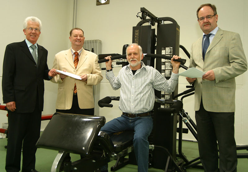 (2. von links) sondern insbesondere auch Fred Baumert als Schulsportleiter (sitzend): Werner Möller (links), Leiter der Gebietsdirektion Nord der Sparkasse Bad Hersfeld-Rotenburg, übergab im Namen der Sparkassenstiftung 1000 Euro zur Förderung und Unterstützung eines multifunktionalen Kraftraums.
