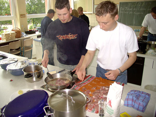 Höhepunkt ihres Projekts war das gemeinsame Zubereiten und Verzehren von Speisen. Dieses geschah jedoch mit einer langen Vorbereitungszeit, denn die Schüler wollten vorher noch mehr über die Herkunft der Lebensmittel wissen. So besichtigten sie einen Biohof und informierten sich dort über die artgerechte Tierhaltung. Außerdem achteten sie beim Einkauf besonders auf die Qualität der Produkte sowie darauf, dass sie aus der heimischen Region stammen. „Natürlich mussten wir einsehen, dass Qualität auch ihren Preis hat“, sagt Alexander Inden. Bei der Zubereitung kam es ihnen darauf an, dass regionale und althergebrachte Rezepte Anwendung fanden. Sieben Stunden werkelten die Schüler in der Küche der Bebraer Berufsschule und zauberten ein sehr abwechslungsreiches Menü hervor: Als erste Vorspeise servierten sie sich und einem Teil ihrer Lehrkräfte Wildkräuter, die sie morgens selbst gepflückt hatten. Breitwegerich, Löwenzahn, Bärlauch, Gänseblümchen und Brennnesseln waren auf den Tellern zu finden. „Es schmeckt erstaunlich gut“, war ihr Urteil. Für die zweite Vorspeise, eine Hühnerbrühe mit Reiseinlage schlachtete Michael Hofmann am Vortag extra ein Huhn aus der eigenen Zucht. Die Schweinelendchen der ersten Hauptspeise stammten aus Gilfershausen. Dazu wurden hessischer Spargel und Kartoffelgratin gereicht. Die zweite Hauptspeise kam aus dem bekannten Biohof: Rinderbraten mit frischem, selbstzubereitetem Rotkohl und Serviettenknödeln nach altem Hausrezept. Frische Erdbeertörtchen im „FOS 12B“-Design und Obstsalat der obersten Qualitätsklasse mit vielen Vitaminen unter der belassenen Schale rundeten das Menü ab.