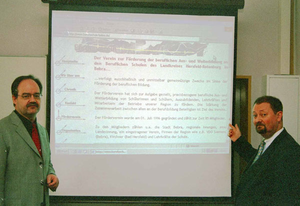 Unter der Adresse www.berufsschule-bebra.de und dem Button „Förderverein“ sind seit neuestem Informationen zum Förderverein der Beruflichen Schulen in Bebra zu finden. Er befasst sich mit der Förderung der Aus- und Weiterbildungsmöglichkeiten an der Bebraer Berufsschule. Durch eine unkomplizierte Vorgehensweise können Schulprojekte wie das Solarhaus, andere Vorhaben oder Veranstaltungen schnell vorangebracht und günstige Angebote wahrgenommen werden. Beispielsweise wurde kürzlich ein „Smartboard“ angeschafft, mit dem die Benutzeroberfläche eines PC-Programms nicht nur groß dargestellt, sondern auch dessen Bedienung möglich ist.