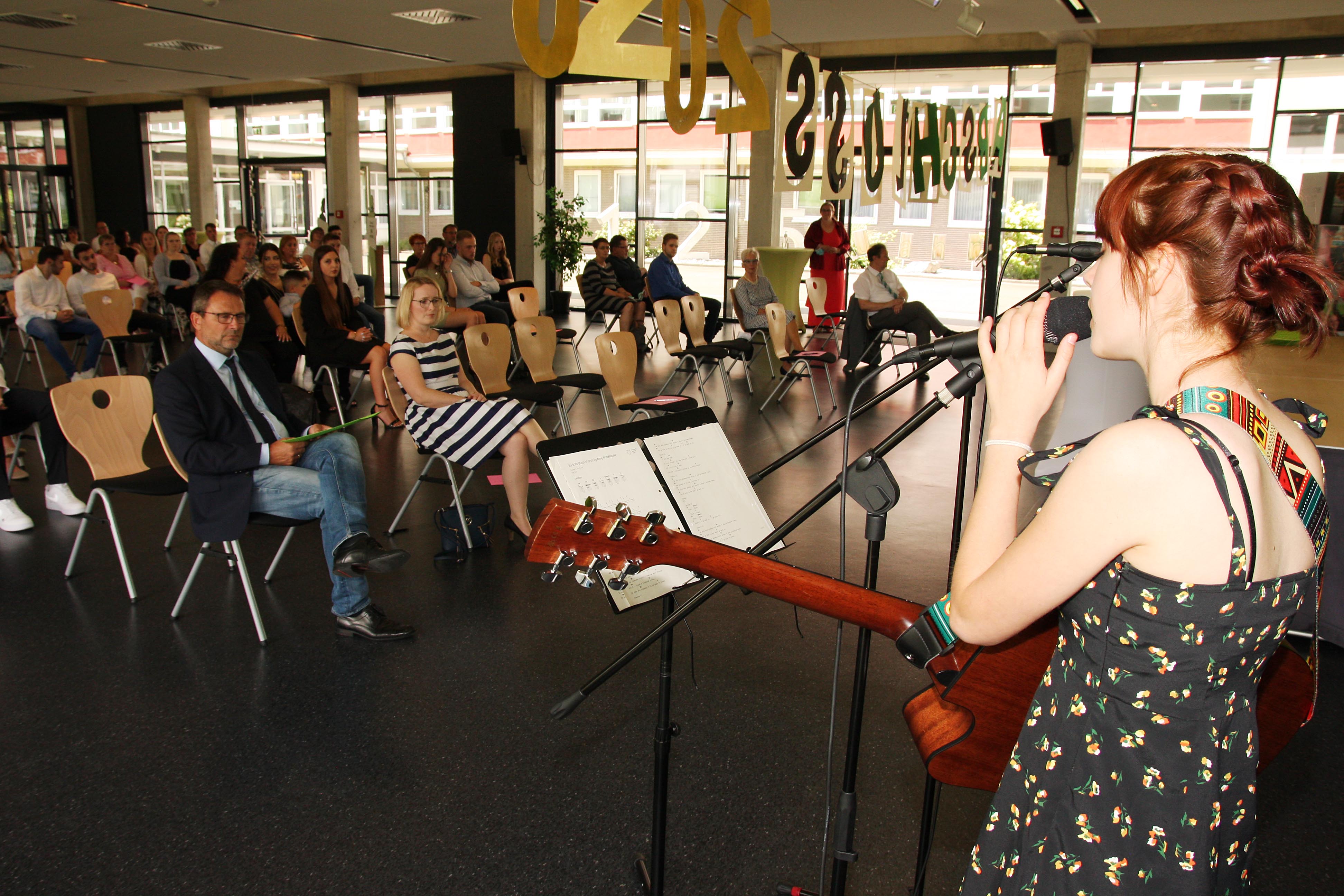 Alle Türen waren im wahrsten Sinne des Wortes geöffnet, um den Hygieneregeln zu entsprechen. Die Absolventen saßen mit ihren Begleitungen im Abstand von 1,5 Meter in der großen Aula verteilt und Ivonne Buchenau begrüßte zu Beginn der Veranstaltung alle Absolventen, Eltern und Freunde sowie Ilse Koch, die Erste Stadträtin der Stadt Bebra und Herbert Heisterkamp, den Vorsitzenden des Fördervereins der Schule.