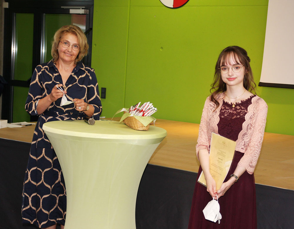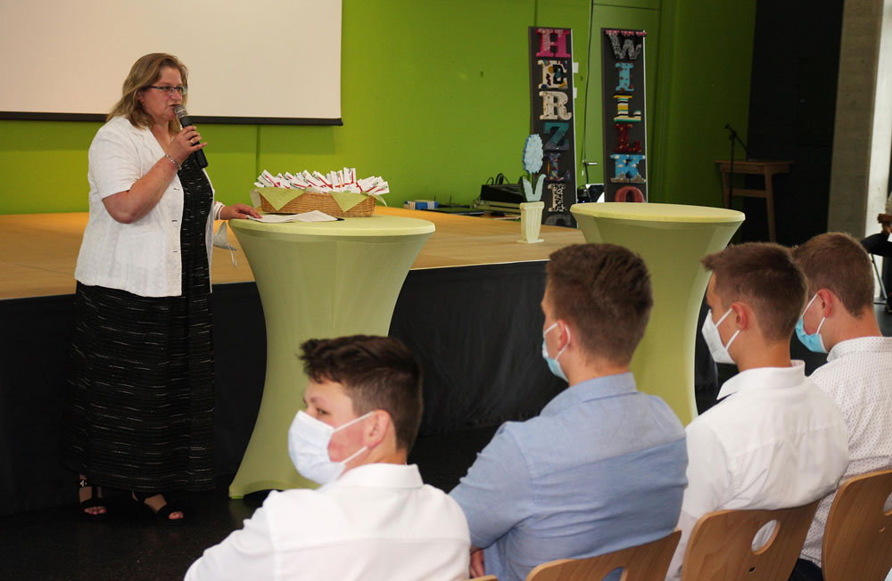 In ihrer Festrede gratulierte Ivonne Buchenau ihren ehemaligen Schülern und Schülerinnen von ganzem Herzen zum bestandenen Abitur und betonte, dass man mit Stolz auf die Ziele zurückblicken kann, die vor drei Jahren mit der Einschulung in das Berufliche Gymnasium gesetzt und mit dem heutigen Tag erreicht wurden sind. Die Abiturienten und Abiturientinnen waren mit einer Vielfalt an Unterrichtsformen konfrontiert, neben Wechsel- und Präsenzunterricht waren auch sie eine kurze Zeit in Distanzunterricht. Buchenau lobte die ehemaligen Schüler und Schülerinnen und sagte „ sie haben bewiesen welches hohe Maß an Flexibilität sie mitbringen und wie fit sie in digitaler Teamarbeit sind, sie haben alle Stolpersteine gemeistert und werden heute mit dem Abitur belohnt. Auch wenn Schule nicht Alltag, sondern Sonderzustand war, sind sie alle am Ziel angekommen.“