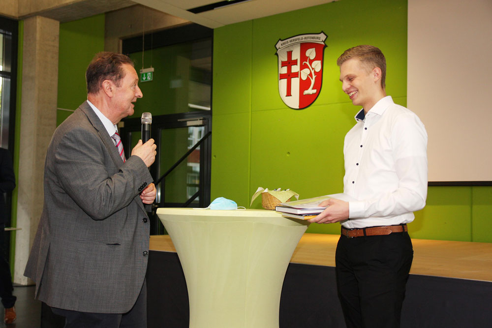 Sebastian Götz, in seiner Doppelfunktion als Tutor und neuer Leiter des Beruflichen Gymnasiums verlas im Anschluss die Grußworte des Bürgermeisters der Stadt Bebra, Stefan Knoche, der auf die Nachteile der pandemischen Situation für der Schüler und Schülerinnen einging und ihnen dennoch Mut machte, nach vorne zu blicken und die Chancen, die das Leben bietet zu nutzen.