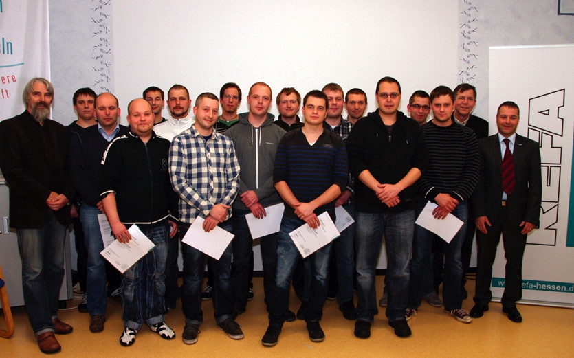Alexander Appel, Ausbildungs- und Geschäftsstellenleiter der Region Hessen-Nord, überreichte gemeinsam mit seinem Kollegen Reiner Hilmes den 16 Studierenden der Fachschule für Technik in Bebra die Urkunden für den erfolgreichen Abschluss des „REFA-Grundscheins Arbeitsorganisation“. Alexander Appel betonte die hohe Wertigkeit der zusätzlichen Qualifizierung im betrieblichen Alltag. Er freute sich über die Motivation der Teilnehmer und darüber, dass die Seminare nun schon zum vierten Mal in Bebra stattfanden und bedankte sich beim Leiter der Bebraer Technikerschule, Dr. Ulrich Schneider, für die gute Zusammenarbeit.