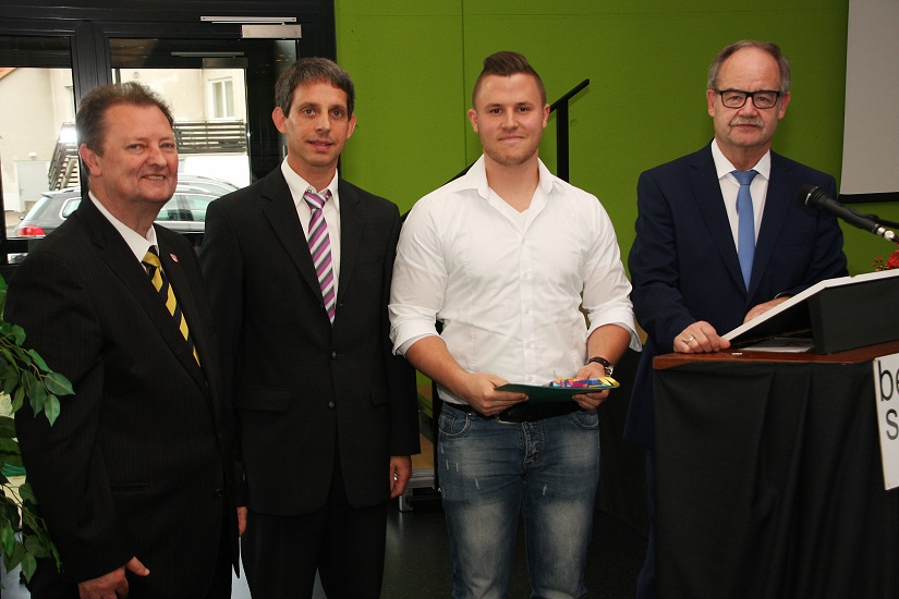 Der beste Absolvent des Jahrgangs 2016 - Benny Witzel - mit Förderverinsvorsitzendem Herbert Heisterkamp, Lehrer Stefan Mohr und Schulleiter Wolfgang Haas (v. l)...