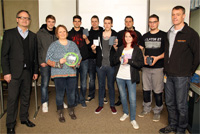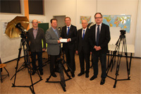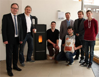 Da freuen sich nicht nur die Schornsteinfegerauszubildenden aus ganz Hessen: Peter Ullrich (2. von links) und Harald Stehl (2. von rechts) übergeben einen Pelletofen für das Solarhaus der Beruflichen Schulen Bebra an Wolfgang Haas (links) und Herbert Heisterkamp (4. von rechts). Kuschelig warm in der kalten Jahreszeit wird jetzt es im Solarhaus der Beruflichen Schulen Bebra - auch wenn die Sonne mal nicht scheint.
