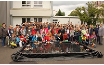 70 Grundschüler aus den 4. Klassen der Brüder Grimm Grundschule in Bebra machten sich mit ihren Lehrkräften auf den Weg zu den Beruflichen Schulen in Bebra, um mit ihren selbst gebauten Booten ein Wettrennen auszutragen.